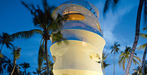 Здесь собраны самые комфортные, красивые и оригинальные дизайнерские решения люксовых курортов на Мальдивах. Например, в ресторане столики установлены прямо в воде.